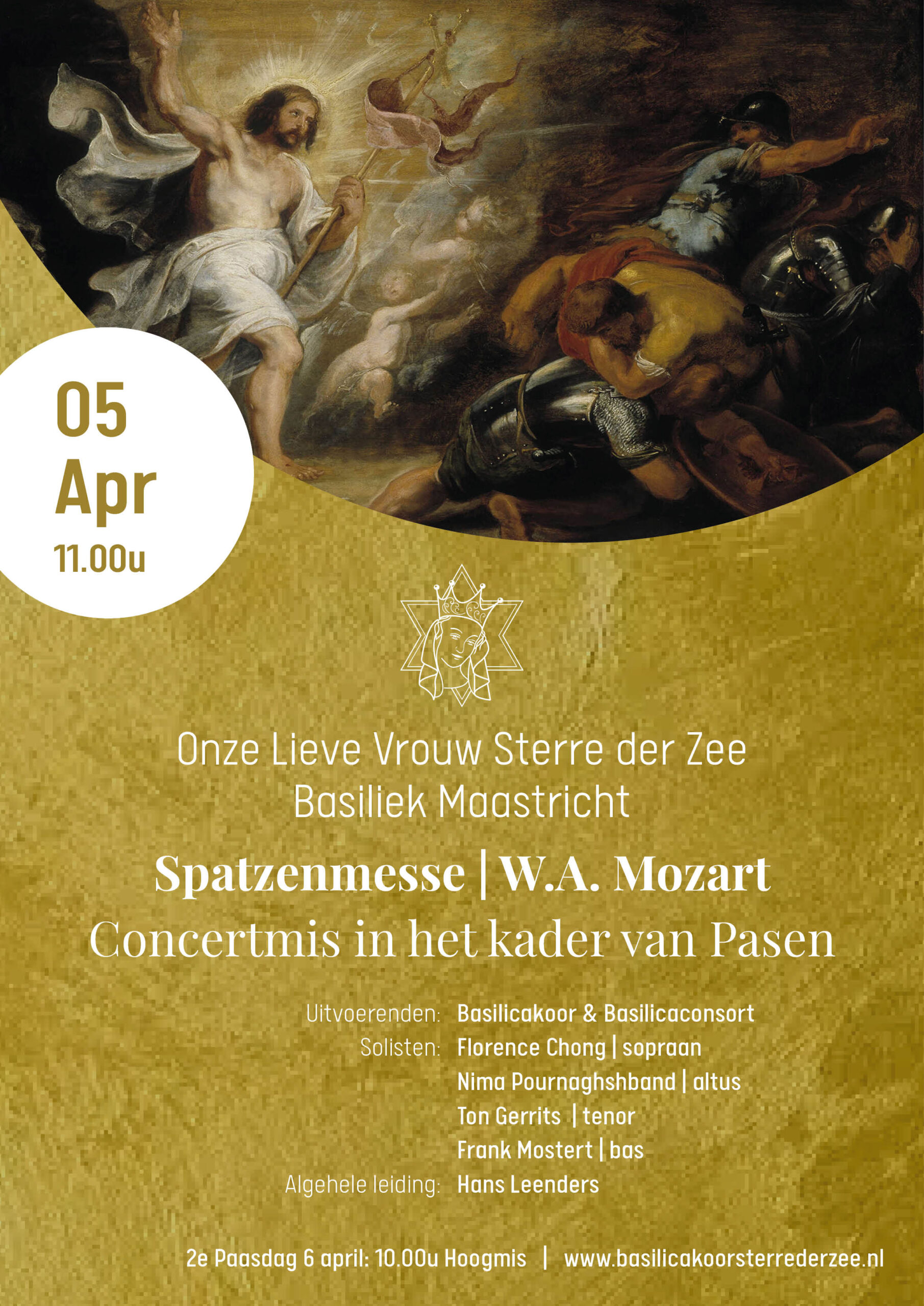 Zondag 5 en maandag 6 april luisteren het Basilicakoor en -consort het Hoogfeest van Pasen op met de feestelijke Spatzenmesse van Wolfgang Amadeus Mozart. Deze mis wordt wel eens een ´missa brevis et solemnis´ genoemd, omdat ze in een eenvoudige structuur kort is als een missa brevis, maar feestelijk opgeluisterd als een missa solemnis met koperblazers en pauken naast vier solisten, strijkers en orgel. De naam Spatzenmesse (Mussenmis) is afgeleid van de vioolfiguren in het Hosanna die lijken op het getjilp van vogels. Naast deze mis speelt het Basilicaconsort een kerksonate van Mozart en zal het bekende Ave Verum klinken van diezelfde componist. Traditioneel sluiten koor en ensemble de Paasvieringen af met het Halleluia uit de Messiah van G.F. Händel.